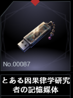 No.00087 とある因果律学研究者の記憶媒体![]() ![]() | 学園都市のデータチップを5つ、Cypherに渡す |