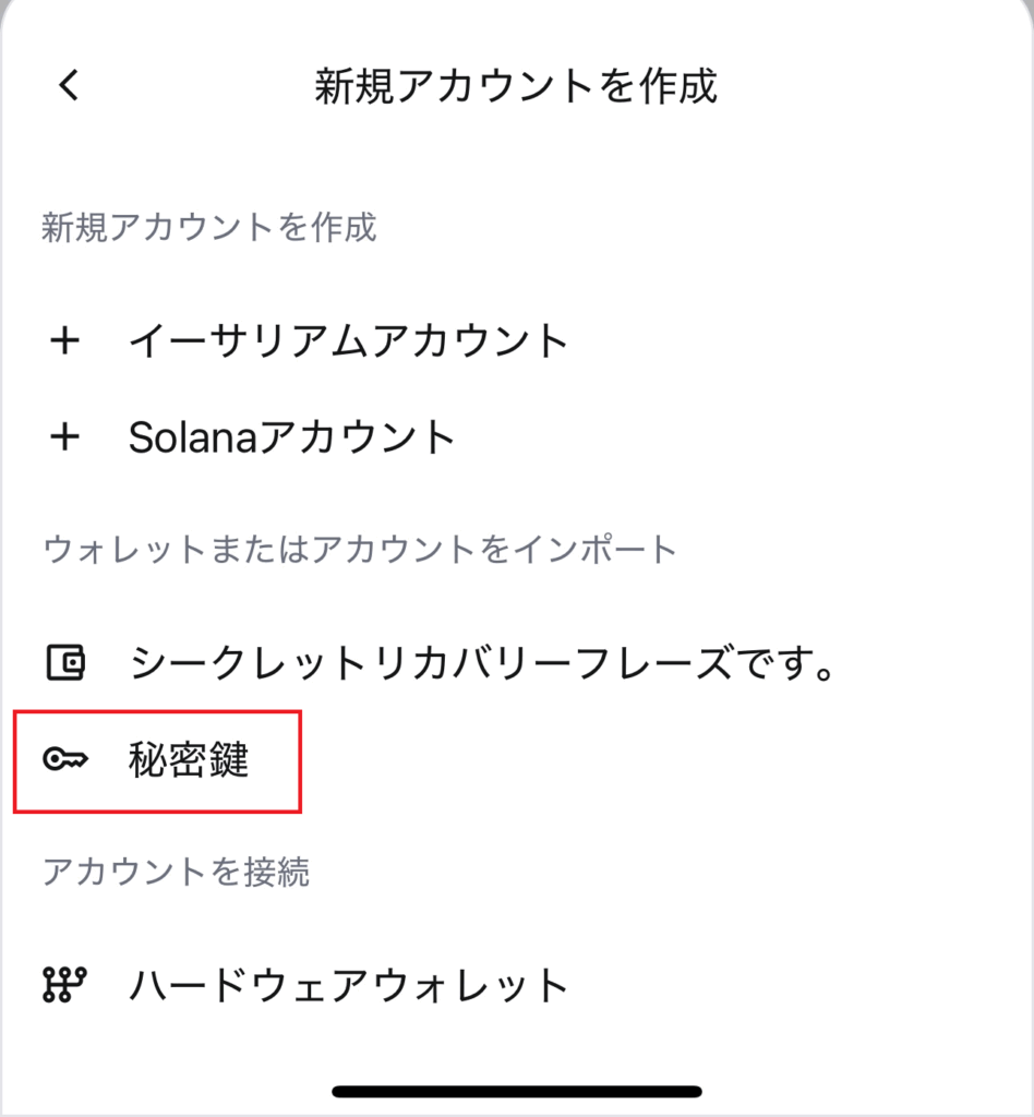 ②表示した秘密鍵をコピーしたら、メタマスク側で秘密鍵を使って新規アカウントを作成します。
