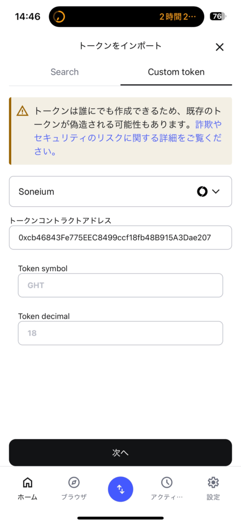 トークンをインポートを選択し、Soneiumチェーンを選択したら、トークンのコントラクトアドレスを入力し、追加します。各トークンのコントラクトアドレスは以下の通りです。