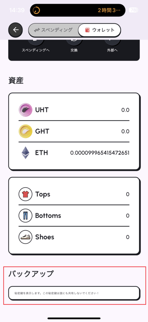 ①アプリ内のウォレットを表示し、バックアップから秘密鍵を表示します。