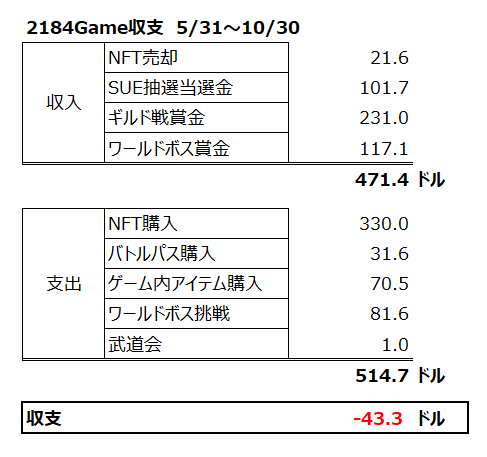 収入が471.4ドル、支出が514.7ドル。収支は-43.3ドルとなりました。