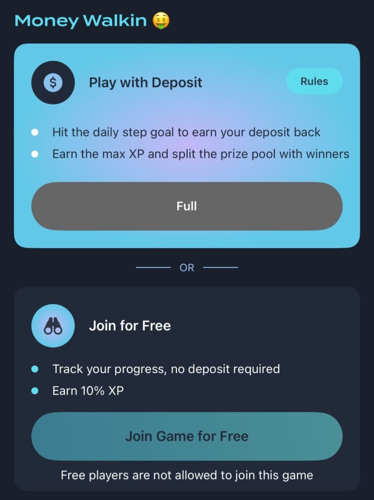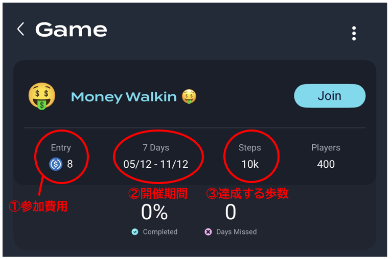 ③達成する歩数 3000歩程度のものから20000歩レベルまで設定されています。達成できないと参加費用から没収されてしまいますので、自分が確実に歩けるゲームに参加する必要があります。