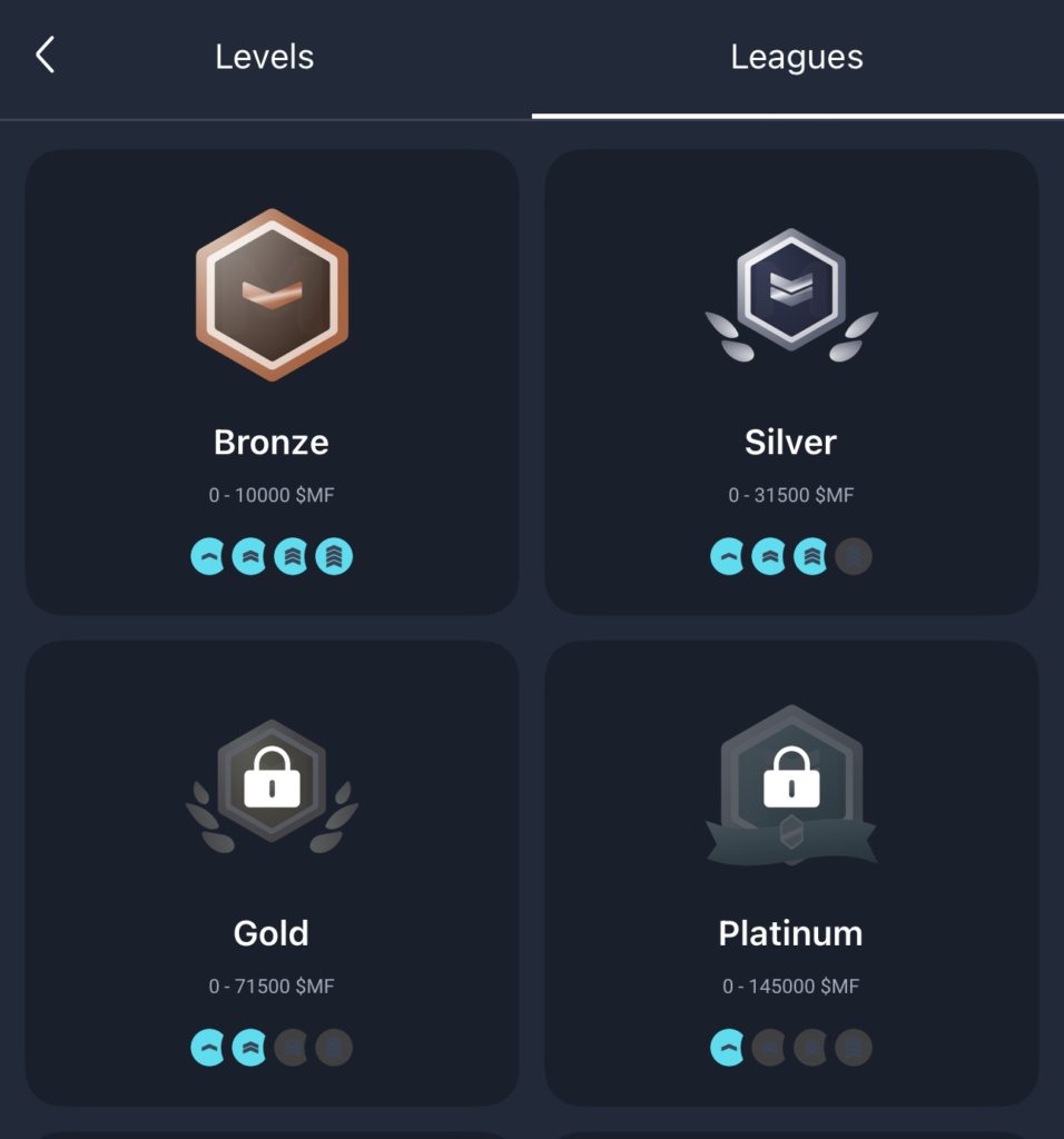 レベル10に到達するとブロンズリーグのTier 1に参加することができます。Tier 2以降はロックしたMFの量に応じて参加できるようになっています。ブロンズリーグの場合、250枚ロックでTier 2、1000枚ロックでTier 3、10000枚ロックでTier 4に参加できます。